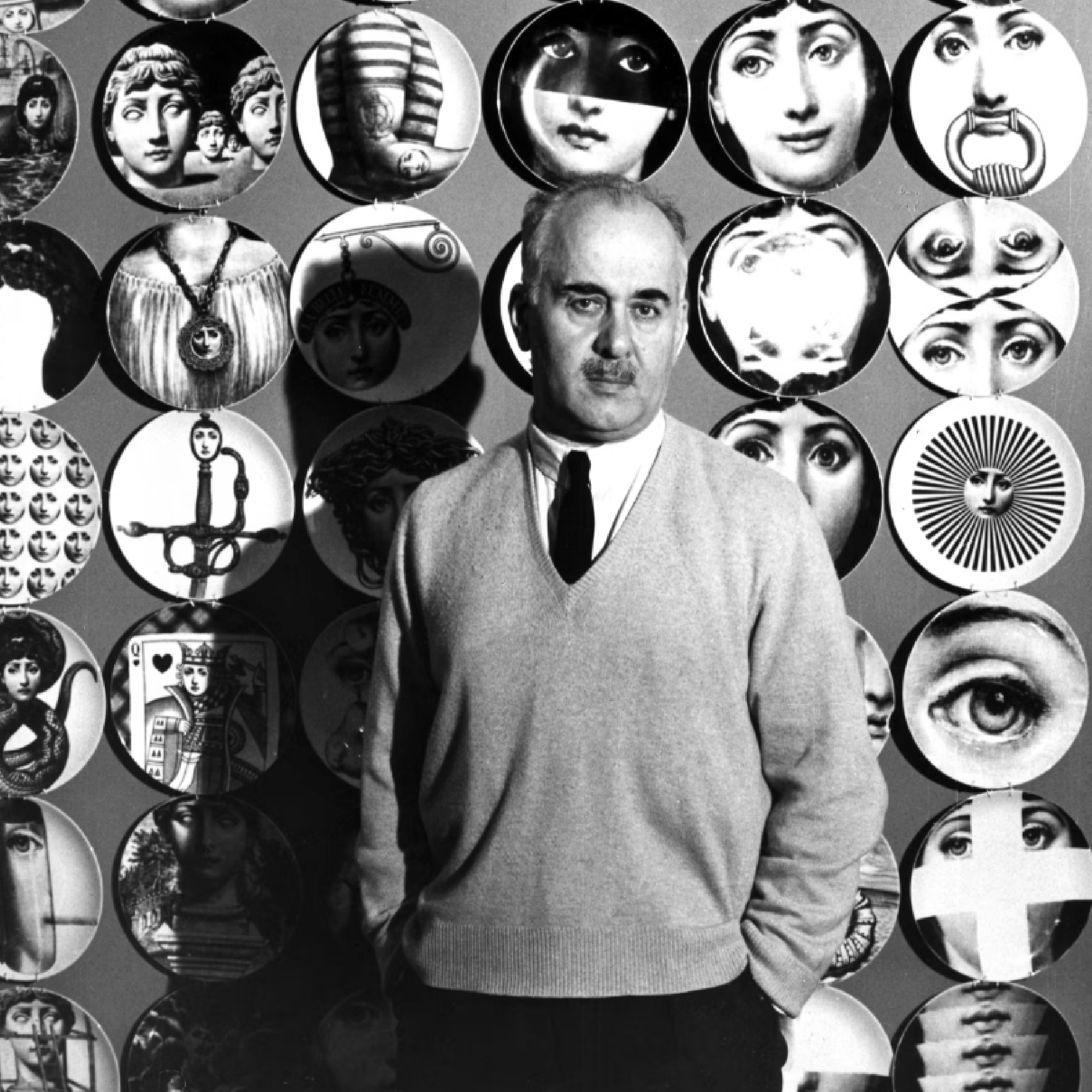 Marked on the reverse with the Barnaba Fornasetti–era stamp, including the All-Seeing Eye and the Hand with Brush, confirming its production by the Fornasetti Atelier in Milan.