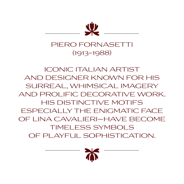 The black-and-white graphic reinterprets the face of Lina Cavalieri, Piero Fornasetti’s enduring muse, a playful yet poetic visual pun where beauty meets human gestures.