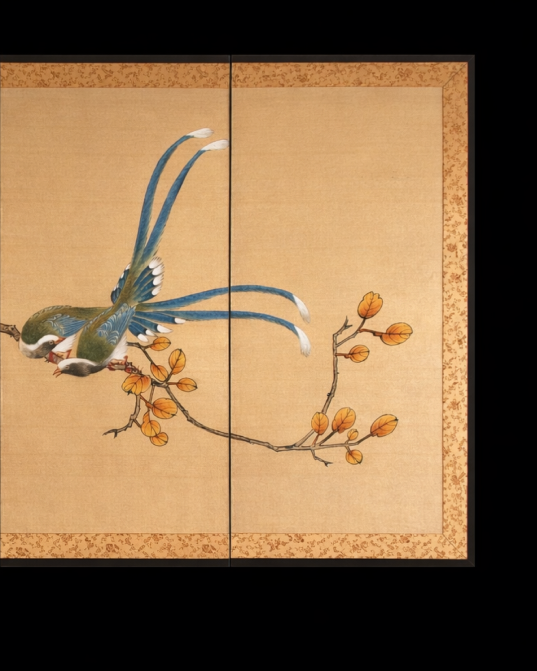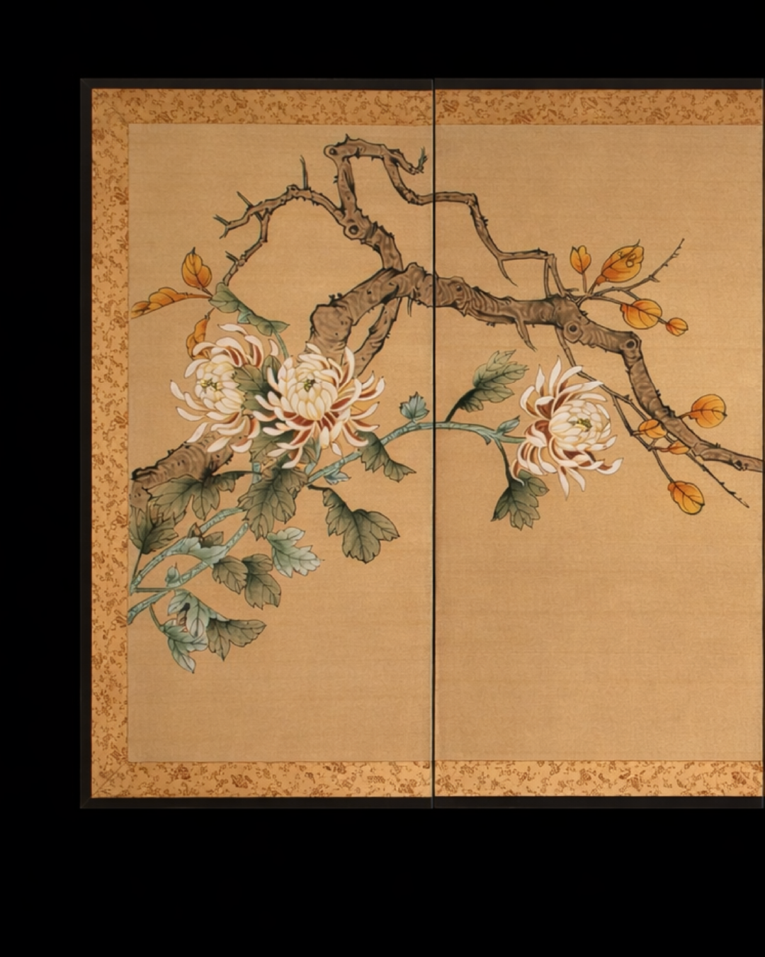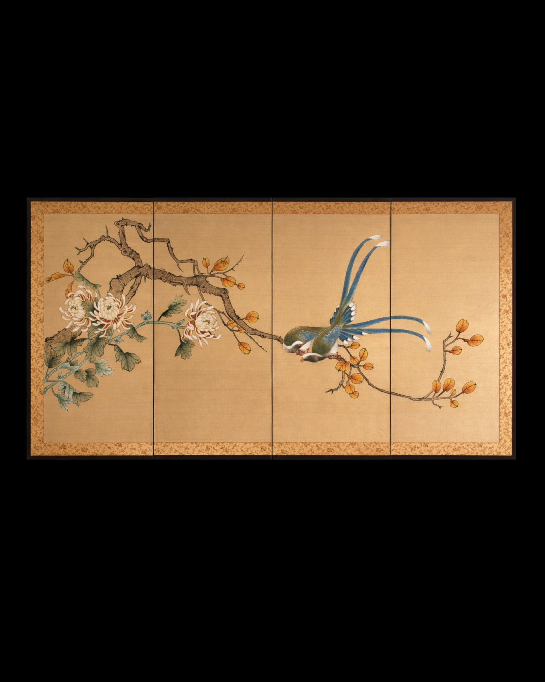 A four-panel silk chinese folding screen with hand-painted bird and chrusanthemus motifs, rendered in a soft, earthy palette.