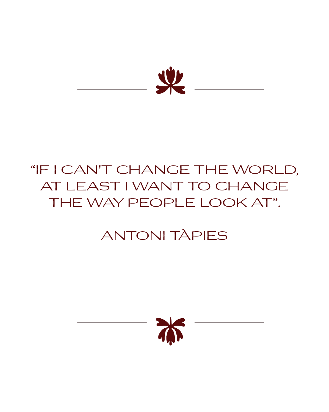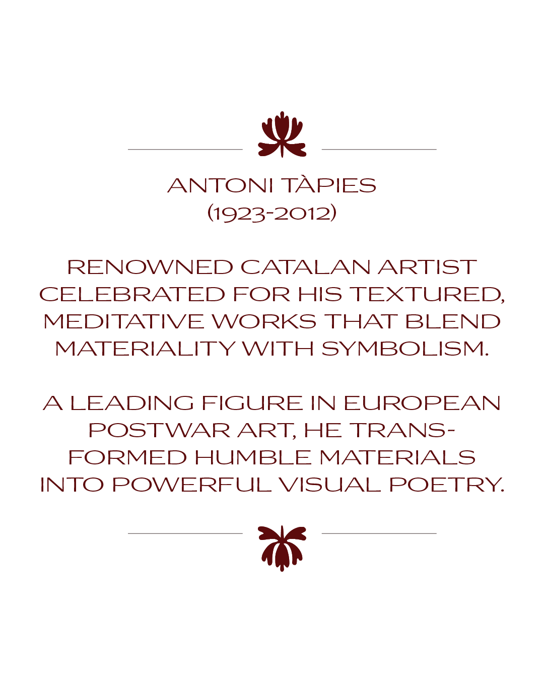 Tàpies’s surfaces are never merely images but territories: dense matter built through impasto, gestural marks, inverted script, and humble materials — earth, marble dust, and pigment — transforming the ordinary into something meditative and metaphysical.
